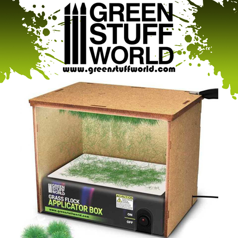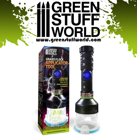 Для зарядки электростатического газона в коробке-аппликаторе Green Stuff World требуется статический электрический ток, в данном случае от батарейки 9 В (не входит в комплект). Этот ток обеспечивает вертикальное расположение волокон на основании или любой другой поверхности, придавая миниатюрным основаниям, моделям или диорам желаемый реалистичный трёхмерный эффект.