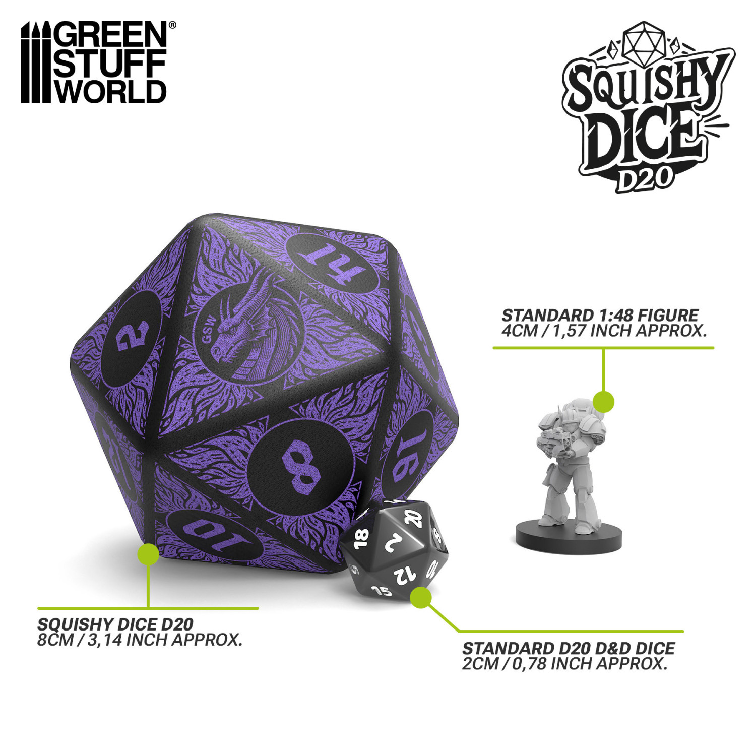 Мягкий куб D20 от Green Stuff World — идеальный аксессуар для любого поклонника ролевых игр, военных игр и гик-культуры в целом. Изготовленная из мягкой на ощупь вспененной ткани, она сочетает в себе яркие цвета и тематическое оформление, становясь забавным украшением как для вашего рабочего стола, так и для игрового стола.