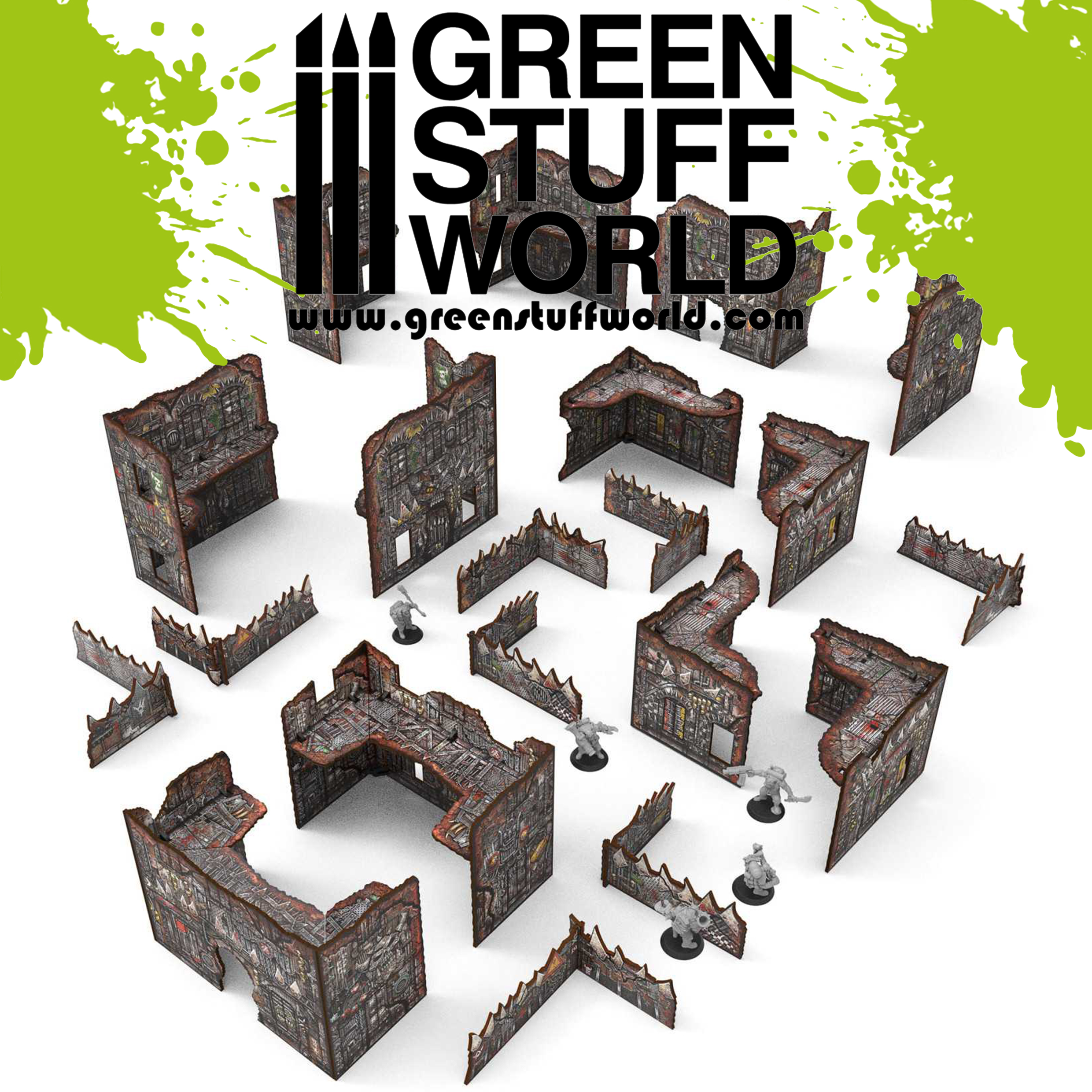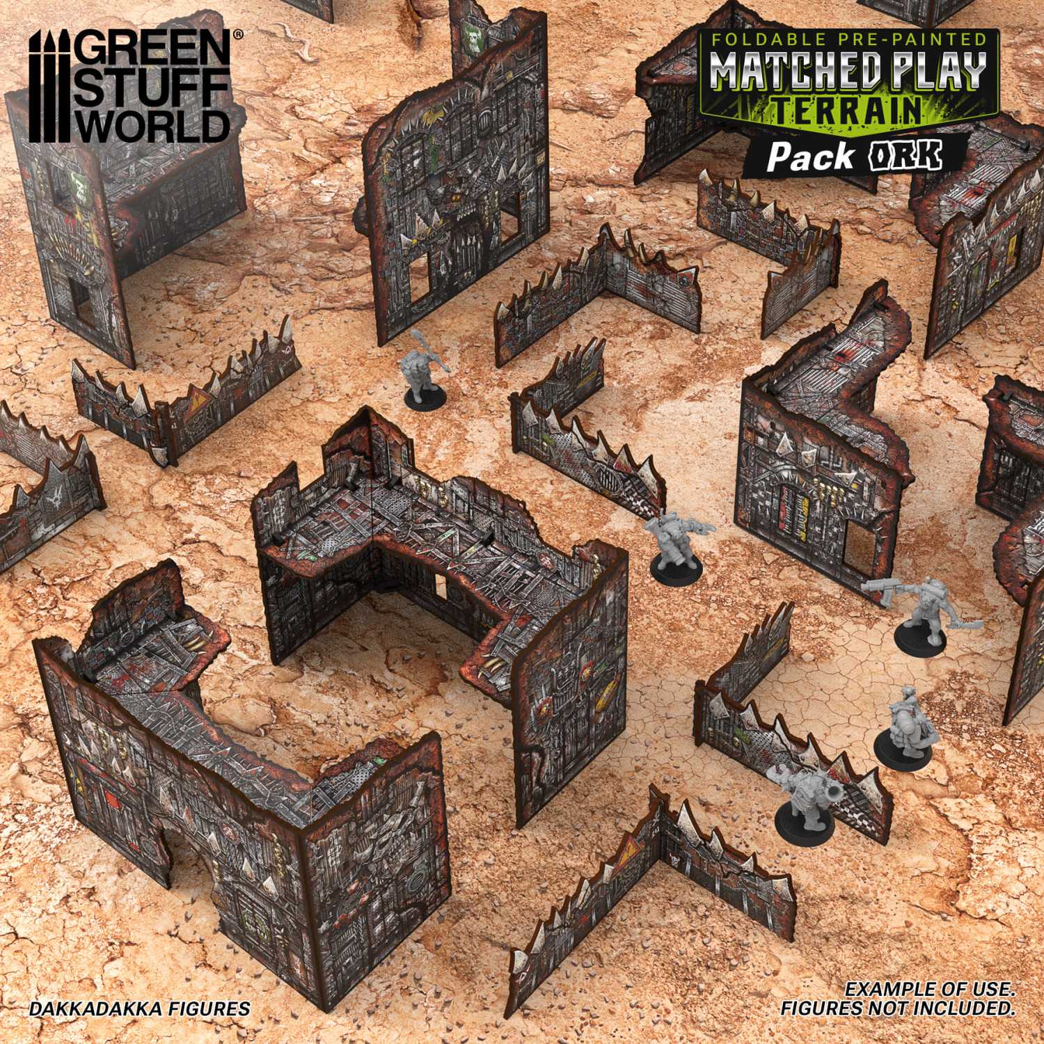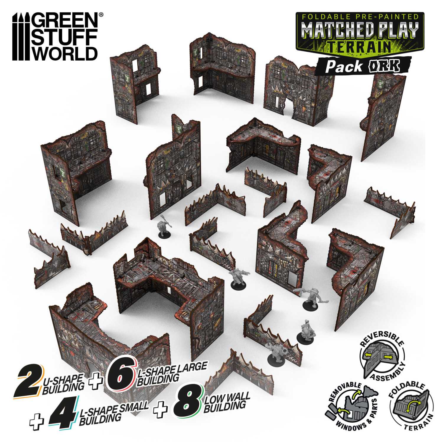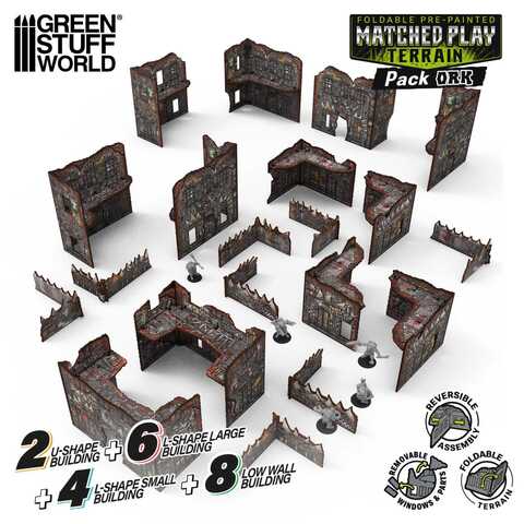Этот набор включает в себя все элементы ландшафта, необходимые для создания полного набора стандартных турнирных макетов : все необходимые U-образные здания, 8 низких стен и 4 небольших L-образных руины — две из них соберите в виде L-образных конструкций, обращенных влево, а две — вправо (после склеивания их ориентация фиксируется). Большие L-образные руины, с другой стороны, обычно склеиваются в одном положении и могут использоваться как в виде L-образной конструкции, обращенной влево, так и вправо, просто повернув всю деталь на 180° при размещении на столе. Для максимальной гибкости и для того, чтобы всегда иметь в наличии все возможные комбинации макетов, мы рекомендуем приобрести 6 дополнительных больших L-образных руин и собрать их в противоположной ориентации по сравнению с первыми 6.