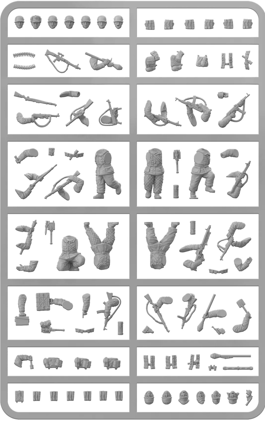Это один пластиковый литник с фигурками зимних парашютистов-пехотинцев. Он содержит 6 тел в различных позах, огромное разнообразие голов и оружия, включая легкий пулемет, пистолет-пулемет, штурмовую винтовку и противотанковый гранатомет Panzerfaust, а также набор рук, позволяющий создавать различные варианты моделей. Идеально подходит для пополнения пехотных подразделений, а также для командиров взводов и корректировщиков огня.