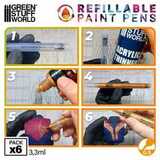 Эти маркеры хорошо работают на различных поверхностях в зависимости от типа краски и её разбавления: бумаге, пластике, стекле, дереве и других, что делает их универсальными для различных задач, таких как рисование комиксов или фигурок в стиле манга. Для достижения наилучших результатов рекомендуется использовать их с акриловыми чернилами или хромированными красками, которые обеспечивают яркое, непрозрачное и ровное покрытие и, как правило, благодаря своей текучести не требуют предварительной подготовки. Их прочная конструкция обеспечивает стабильную работу, а эргономичный дизайн обеспечивает комфортную работу при длительном использовании.