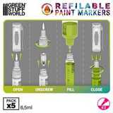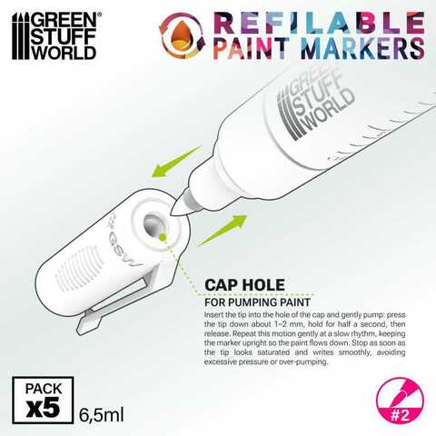 Эти маркеры хорошо работают на различных поверхностях в зависимости от типа краски и её разбавления: бумаге, пластике, стекле, дереве и других, что делает их универсальными для различных задач, таких как рисование комиксов или фигурок в стиле манга. Для достижения наилучших результатов рекомендуется использовать их с акриловыми чернилами или хромированными красками, которые обеспечивают яркое, непрозрачное и ровное покрытие и, как правило, благодаря своей текучести не требуют предварительной подготовки. Их прочная конструкция обеспечивает стабильную работу, а эргономичный дизайн обеспечивает комфортную работу при длительном использовании.