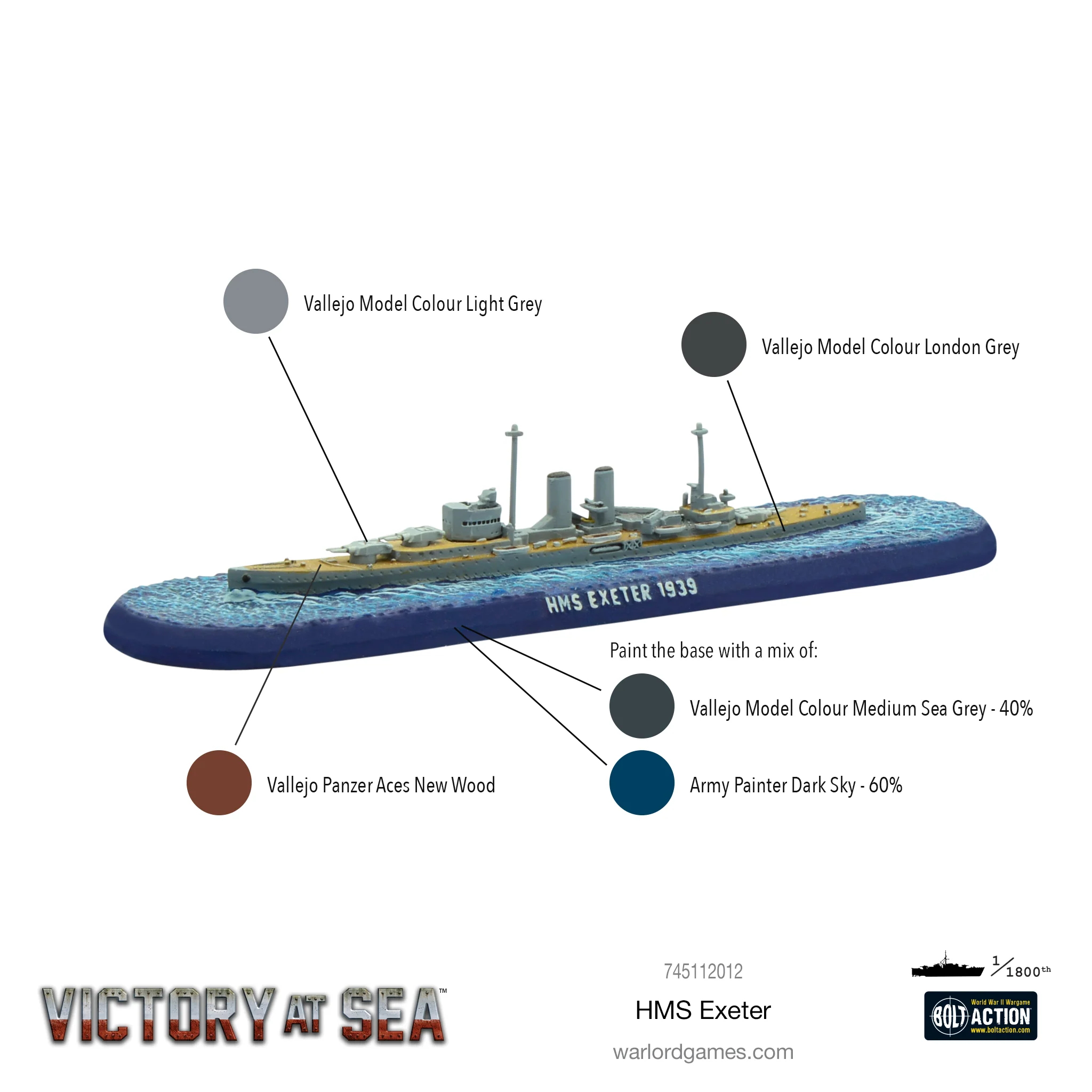 Известно, что линкор HMS Exeter принимал участие в битве при Ла-Плате, но получил серьёзные повреждения во время столкновения с линкором Admiral Graf Spee Кригсмарине . Позже Exeter был отремонтирован, после чего принял участие в операциях на Дальнем Востоке. Принимая участие в битве в Яванском море, Exeter получил серьёзные повреждения и был потоплен два дня спустя японским огнём и торпедами, когда началась Вторая битва в Яванском море…