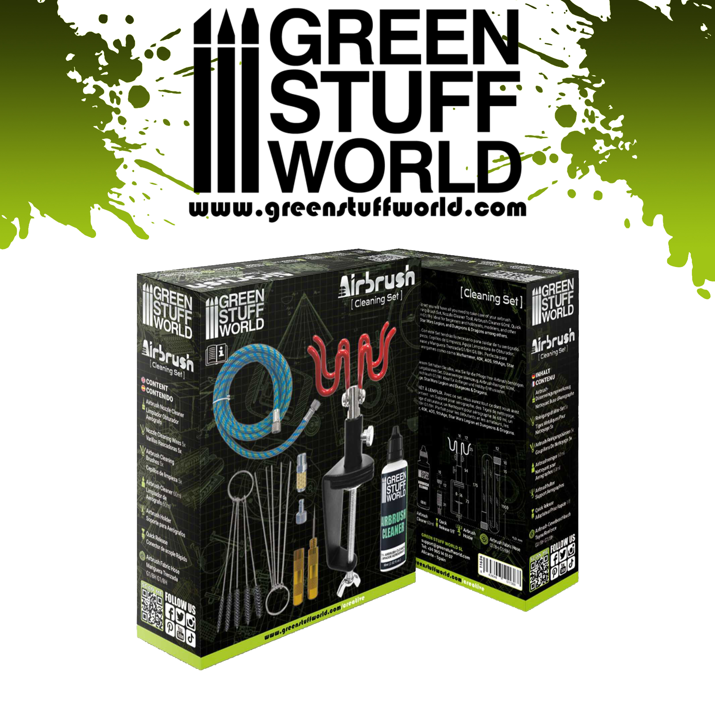 В комплект входят различные инструменты, такие как набор чистящей проволоки и щеток, игольчатый инструмент для сопла, очиститель для аэрографа объемом 60 мл, быстросъемный адаптер, тканевый шланг и, наконец, держатель.