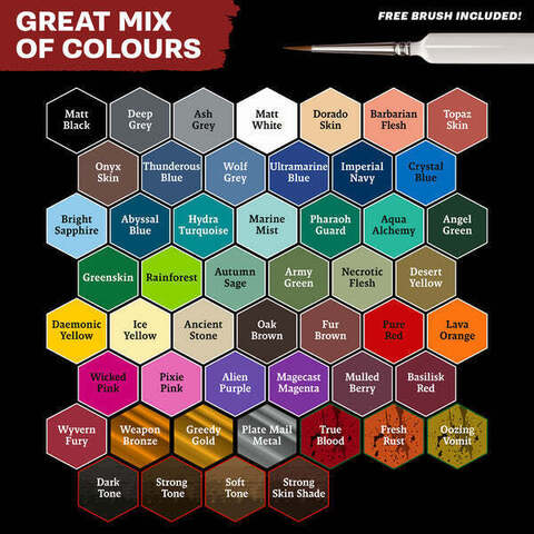 Mega Paint Set содержит 50 тщательно отобранных красок по БЕЗУМНОЙ цене — что делает его лучшим выбором среди красок для хобби! В комплект входят 36 ярких акриловых цветов, 4 оттенка кожи, 3 металлизированные краски, 3 эффектные краски и 4 проливки — всего 50 красок.