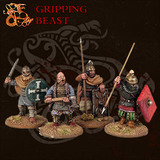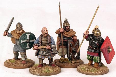 Два отдельных вида больших круглых щитов Тёмной эпохи и щитов типа «рус». Фигура, стоящая с прижатым к земле щитом, имеет литой щит.