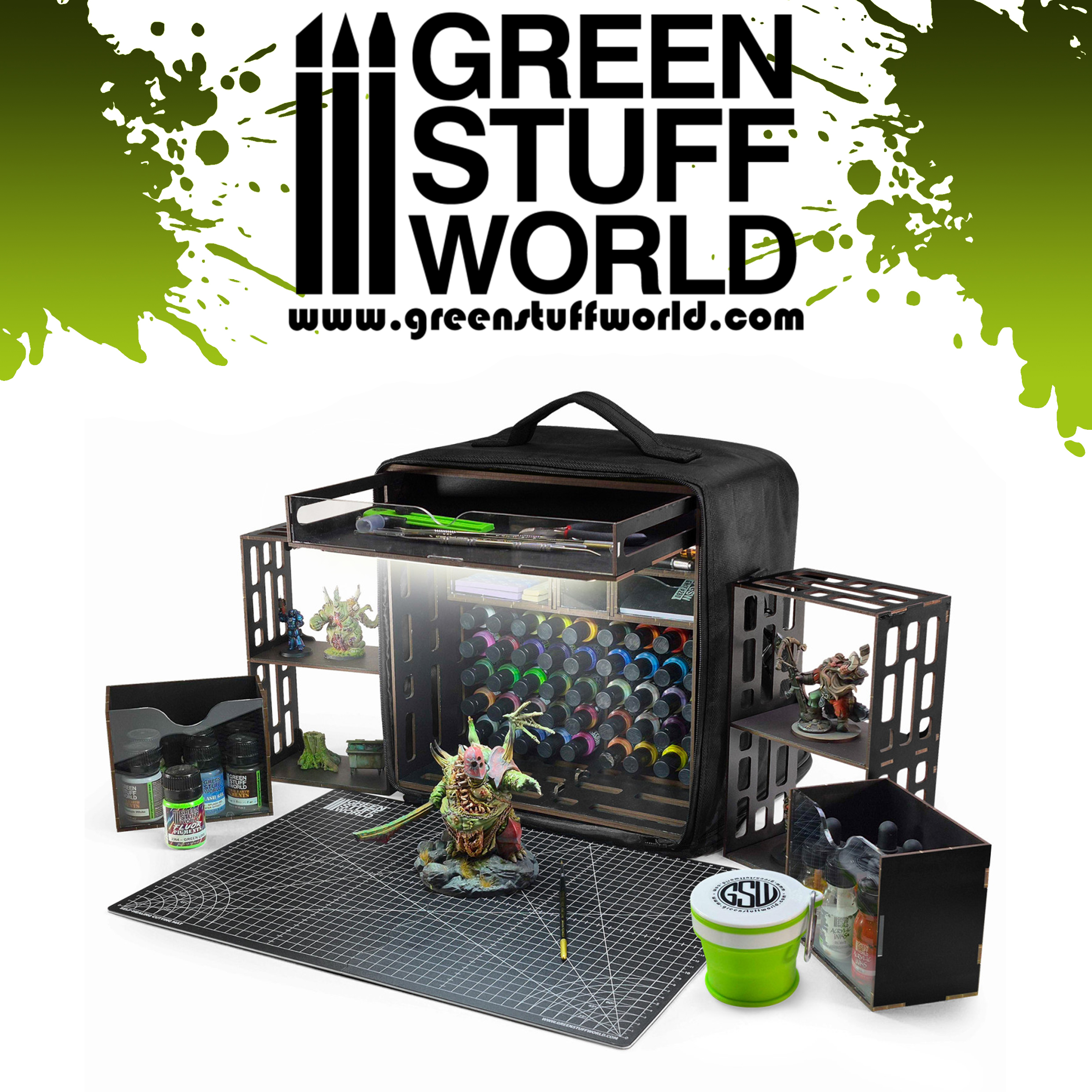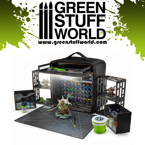 Представляем ультракомпактную портативную станцию для покраски Green Stuff World — легкое, удобное для путешествий рабочее место, разработанное для художников-миниатюристов, моделистов и любителей рукоделия, которым нужна максимальная организация пространства при минимальных габаритах. Ее базовые размеры оптимизированы до 30×30 см, но в разложенном виде она представляет собой удивительно полный комплект — идеально подходящий для домашнего рабочего стола, сеансов покраски с друзьями, кружков и мероприятий.