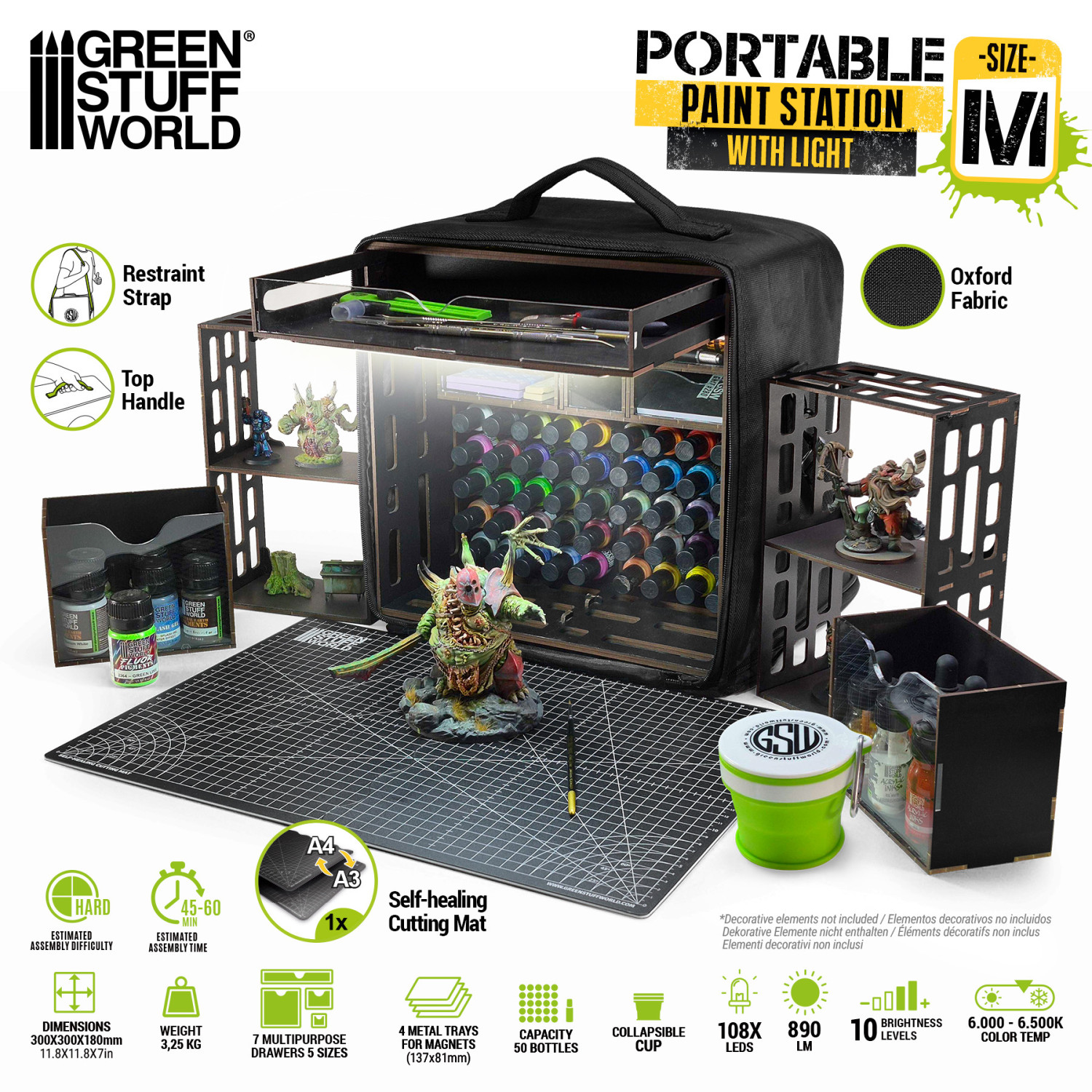 Несмотря на небольшие размеры, эта портативная станция для покраски раскладывается за считанные секунды, включая две боковые полки, складной коврик для резки формата А3 и складной силиконовый стаканчик для воды. Все элементы разработаны для максимальной функциональности при сохранении низкого веса и порядка в рабочем процессе.
