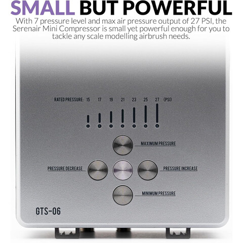 Благодаря семи регулируемым уровням давления и максимальной мощности 27 PSI, компрессор GTS-06 обеспечивает плавный и равномерный поток воздуха для точного нанесения краски на модели, миниатюры и диорамы. Независимо от того, наносите ли вы тонкие тени, базовое покрытие или детализацию, этот компрессор гарантирует оптимальный контроль над потоком краски. Регулируемые настройки давления также делают его подходящим для широкого спектра красок и техник, от тонких линий и градиентов до широкого покрытия, предоставляя пользователям полную творческую свободу.
