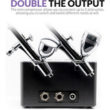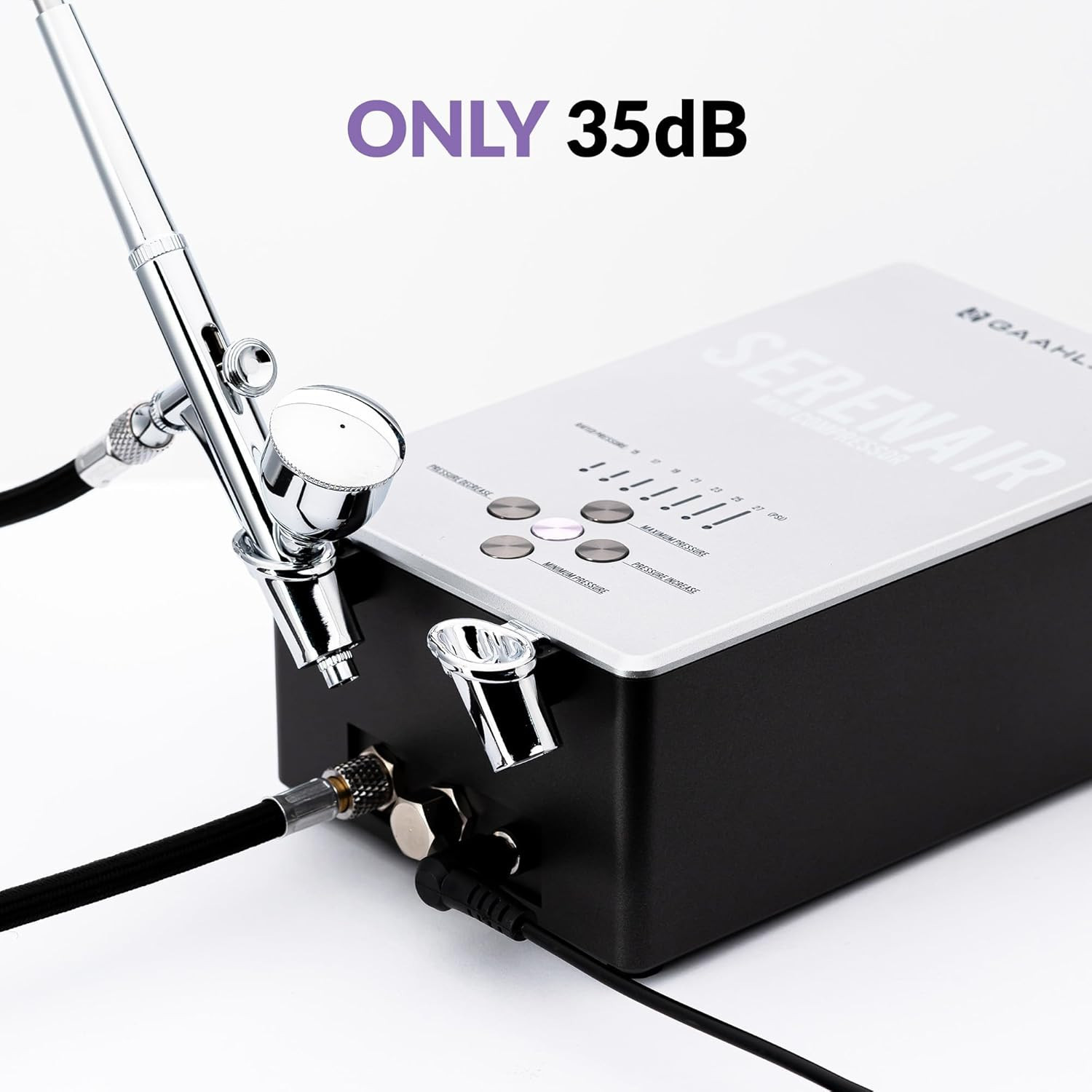 Одной из отличительных особенностей Gaahleri GTS-06 Serenair является двойной выход для аэрографа, позволяющий одновременно подключать два аэрографа. Это обеспечивает быструю смену цвета или сопла без прерывания рабочего процесса — идеально подходит для профессиональных моделистов или художников, работающих над сложными проектами, требующими эффективности. Несмотря на компактные размеры, устройство обеспечивает стабильную мощность с минимальным уровнем шума, примерно 65 дБ, поэтому его можно комфортно использовать в студиях, мастерских или даже дома, не создавая помех.