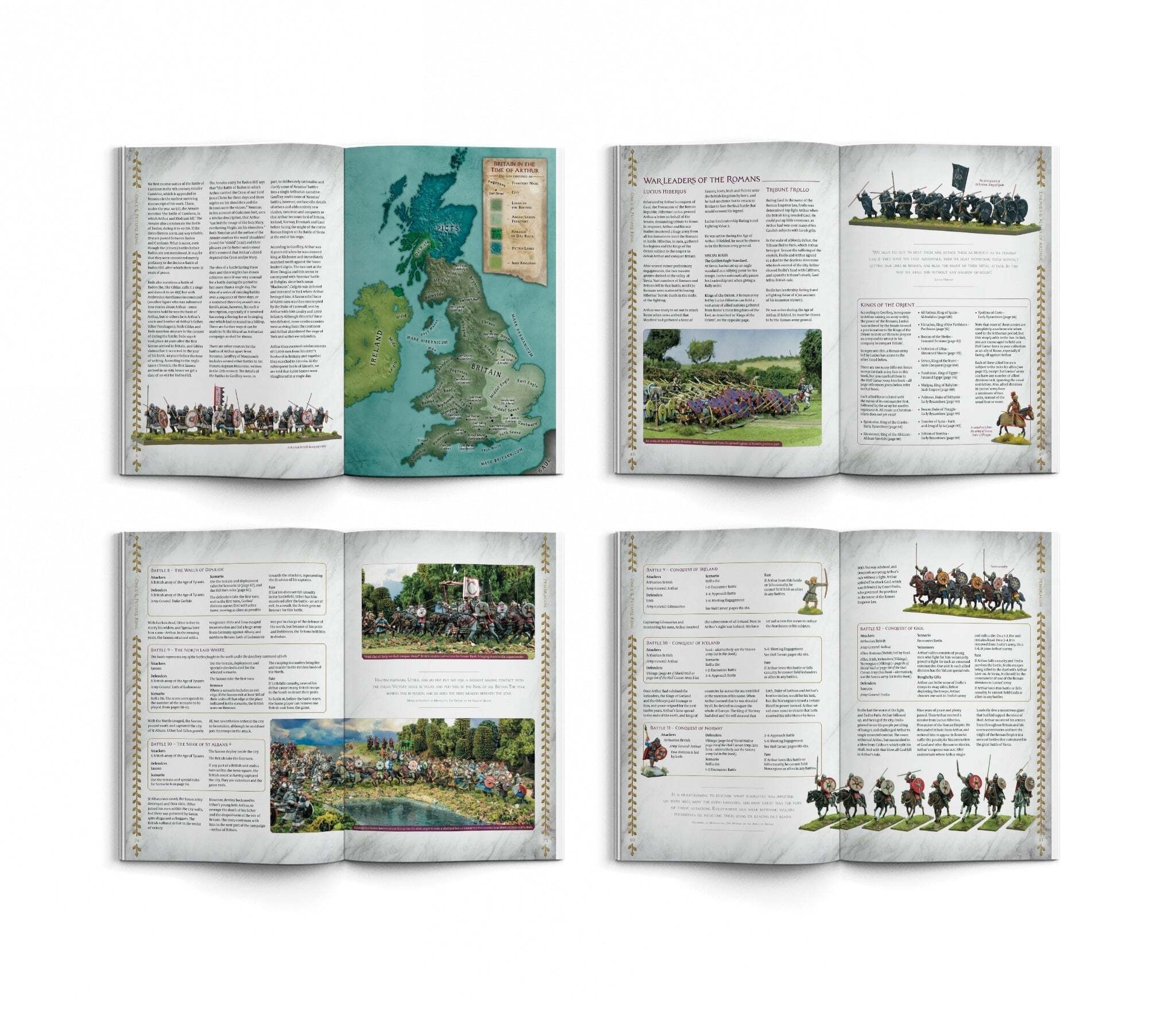 Подробно описаны сценарии двенадцати битв Артура, включая его последнюю битву при Камланне, где он столкнулся со своим врагом Мордредом. Система кампаний позволяет разыгрывать их как единое повествование, с возможностью играть за Артура в валлийском, северном, южном или панбританском контексте. Дополнительная кампания переносит на столы сражения, описанные в фальшивой истории Артура, написанной Джеффри Монмутским, чьи победы достигли кульминации в масштабной битве при Сиезии, где Артур и его союзники столкнулись с мощью Рима и его союзников на Востоке.