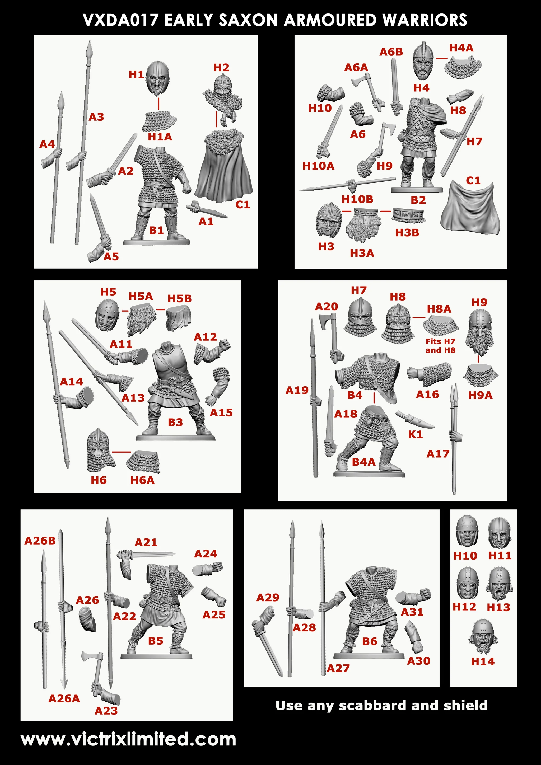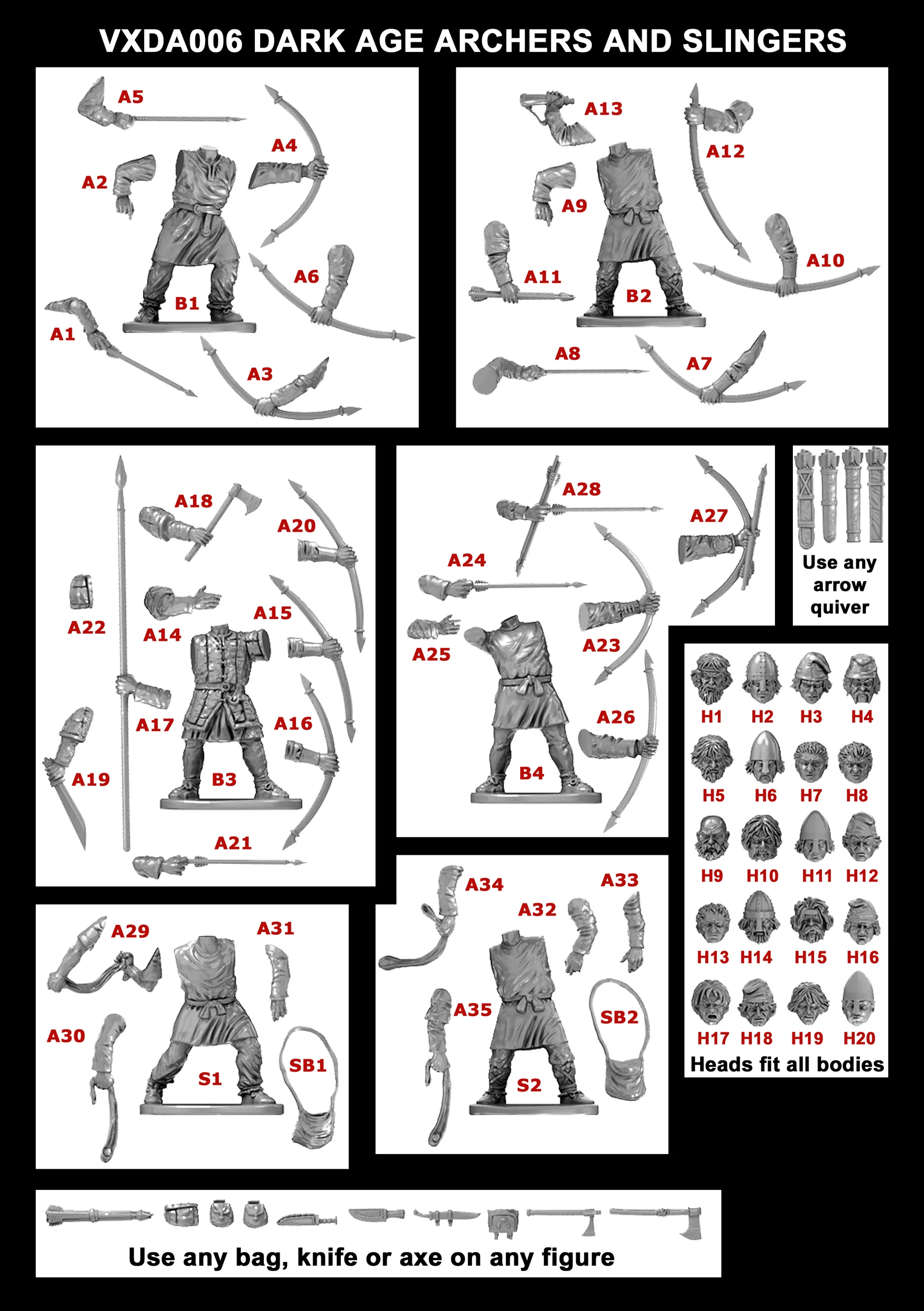 В набор входит широкий выбор поз, оружия, щитов и вариантов голов, позволяющих собрать всё — от элитных воинов в шлемах и плащах до легковооруженных налетчиков и стрелков с луками. Этот набор предоставляет всё необходимое для создания полноценной армии раннего саксонского периода.