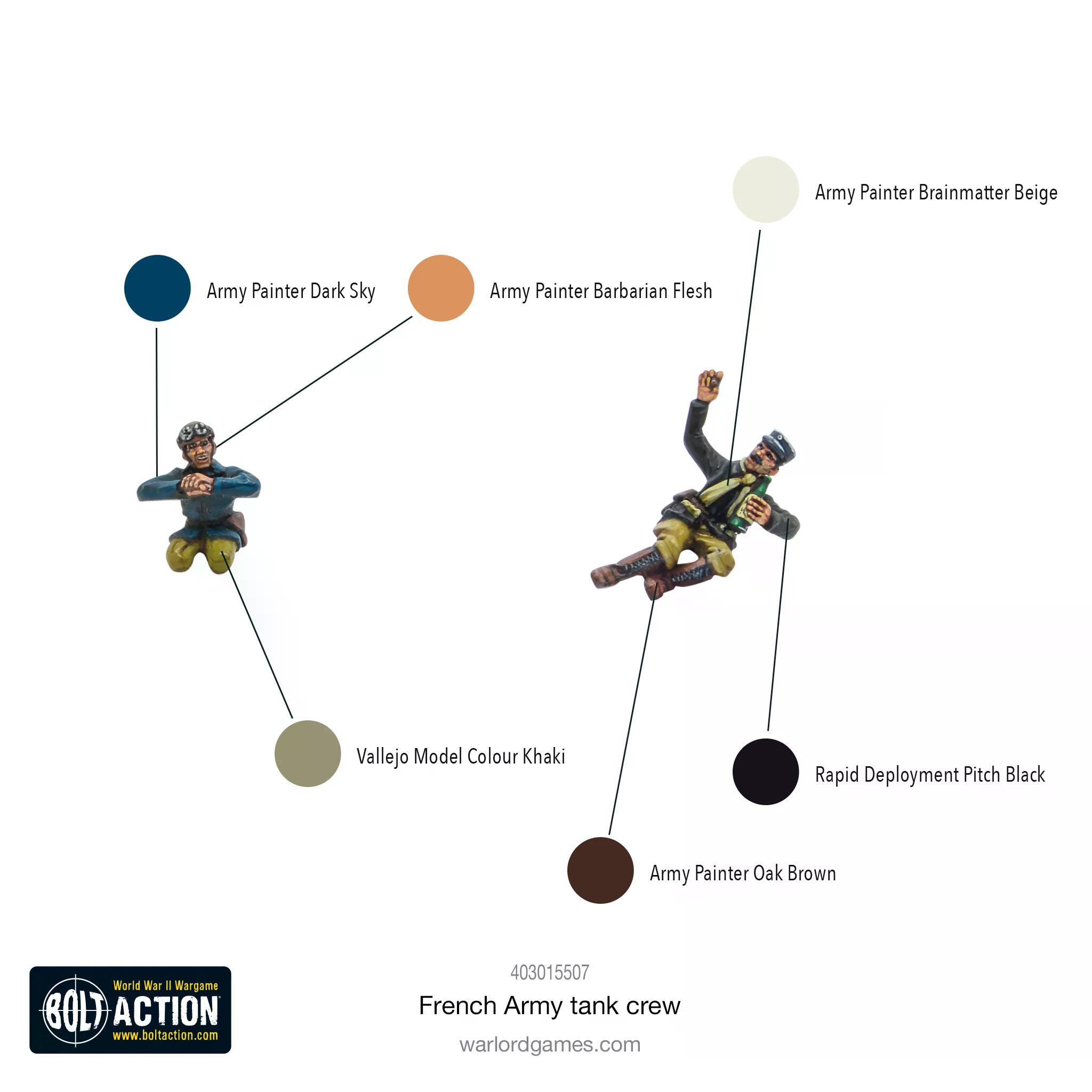 Этот набор, включающий четыре различные неполные фигурки для установки в люки ваших французских машин, а также три фантастические спешенные фигурки, представляющие либо катапультировавшийся экипаж, либо командиров танков, выполняющих разведку, — идеальный способ придать индивидуальность вашим французским танкам Bolt Action!