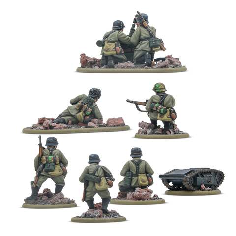 Этот набор предоставляет вам три группы оружия для поддержки вашей немецкой ветеранской пехоты, экипированной для ближнего боя. Команда снайперов угрожает офицерам и наблюдателям противника, в то время как команда легких минометов обеспечивает смертельный огонь с близкого расстояния в поддержку ваших стрелковых взводов. Наконец, уникальная и мощная дистанционно управляемая мина Goliath может быть развернута для уничтожения даже самых укрепленных укреплений. Специалисты, вперед!