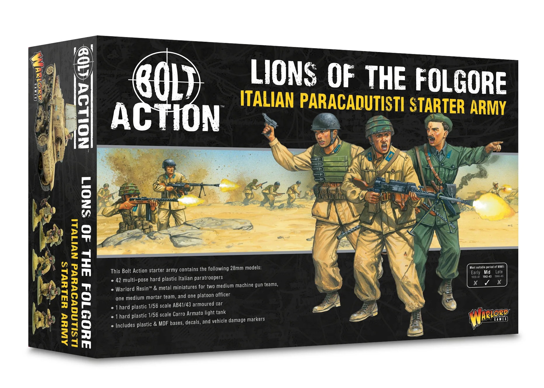Этот набор содержит всё необходимое для создания могучей армии итальянских десантников в игре Bolt Action! В его основе лежат 42 пластиковых десантника, позволяющие собрать стрелковый взвод, полный закалённых ветеранов, а также командиров взводов. Огневую поддержку обеспечивает взвод тяжёлого вооружения, состоящий из двух расчётов средних пулемётов и среднего миномёта, а бронетанковый взвод, состоящий из бронеавтомобиля AB 41 и штурмовой пушки Semovente (которую также можно собрать как лёгкий танк M13/40 Carro Armato), обеспечивает механизированный удар.