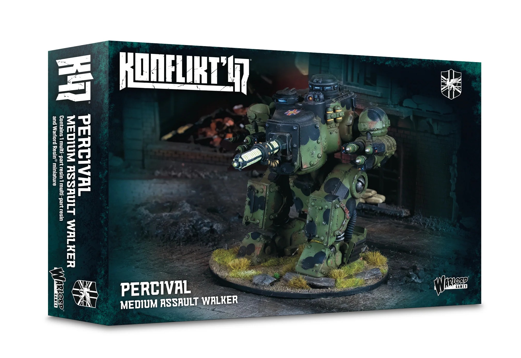 В коробке находится одна сборная модель из смолы, а также средний штурмовой шагоход Percival от Warlord Resin, лист с декалями для техники, подставка из МДФ и инструкция по сборке.