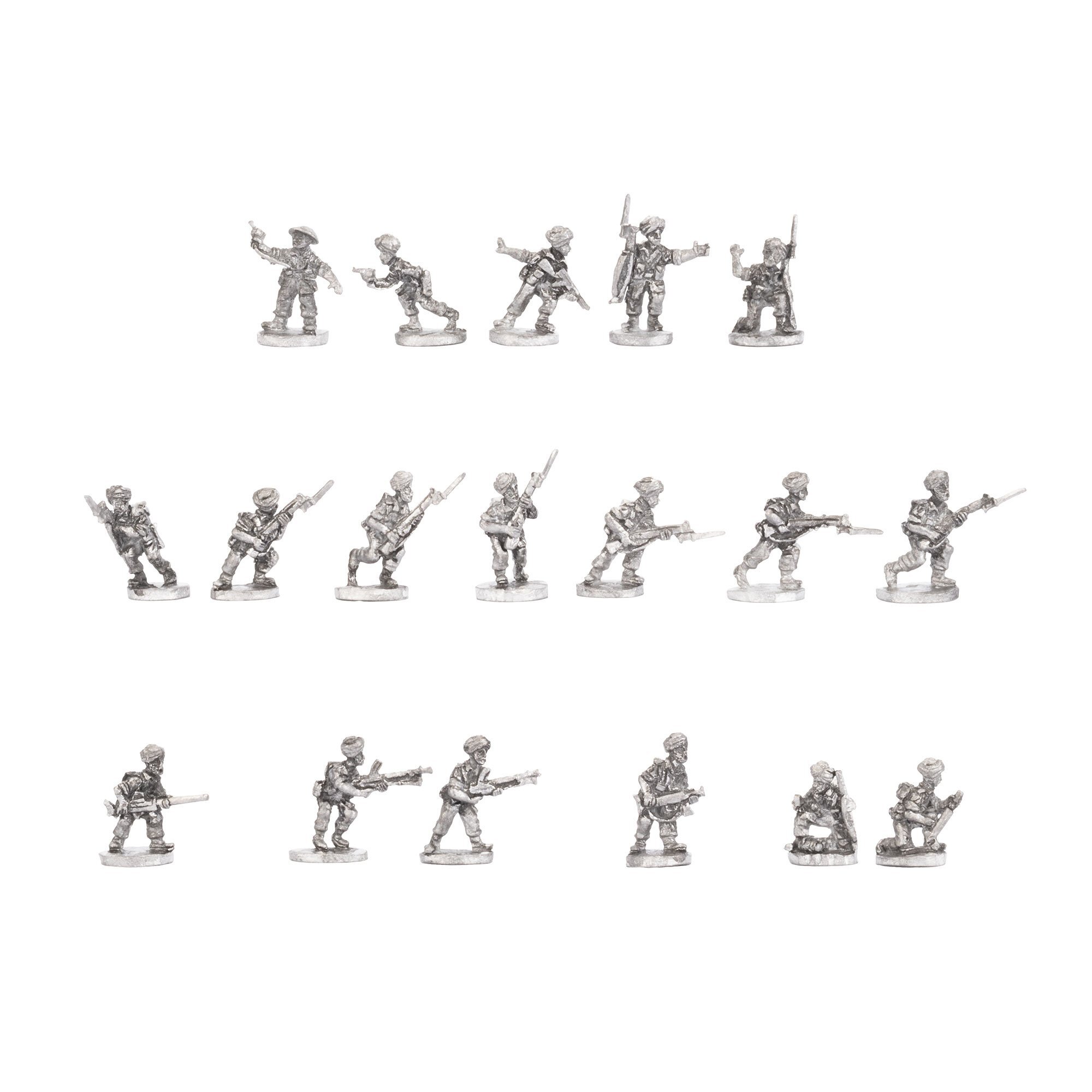 Индийские войска, отправленные в Бирму и Малайю для укрепления обороны на случай японского нападения, были спешно сформированы и отправлены на театр военных действий с намерением провести их надлежащую подготовку по прибытии. Однако японское нападение было стремительным, и обучение было ограниченным. К 1943 году подготовка местных индийских войск значительно улучшилась, но специализированная подготовка к войне в джунглях все еще была ограничена. Благодаря улучшенной организации, снабжению и обучению, к 1943 году индийские стрелки стали равны своим британским товарищам, часто проявляя энтузиазм в бою, невиданный у их более консервативно настроенных британских братьев по оружию. Каждое стрелковое отделение имеет ручной пулемет Bren или похожий на него Vickers-Berthier, а также винтовки и гранаты. Как и у британских стрелков, взводы индийской армии также имели в каждом взводе 2-дюймовый легкий миномет и противотанковое ружье Boys.