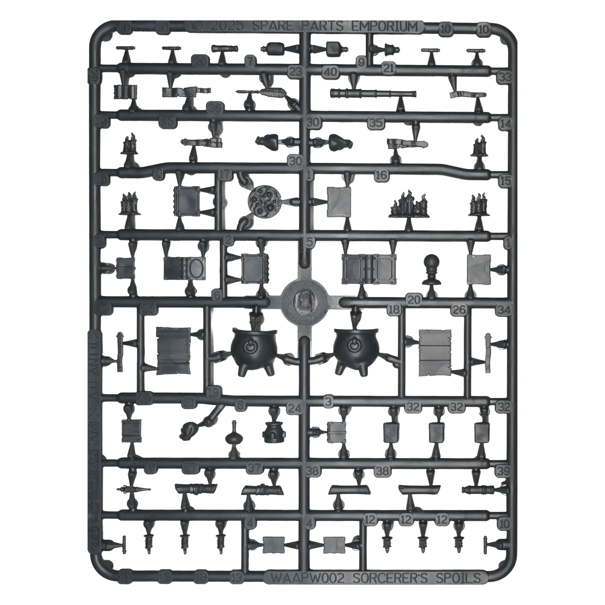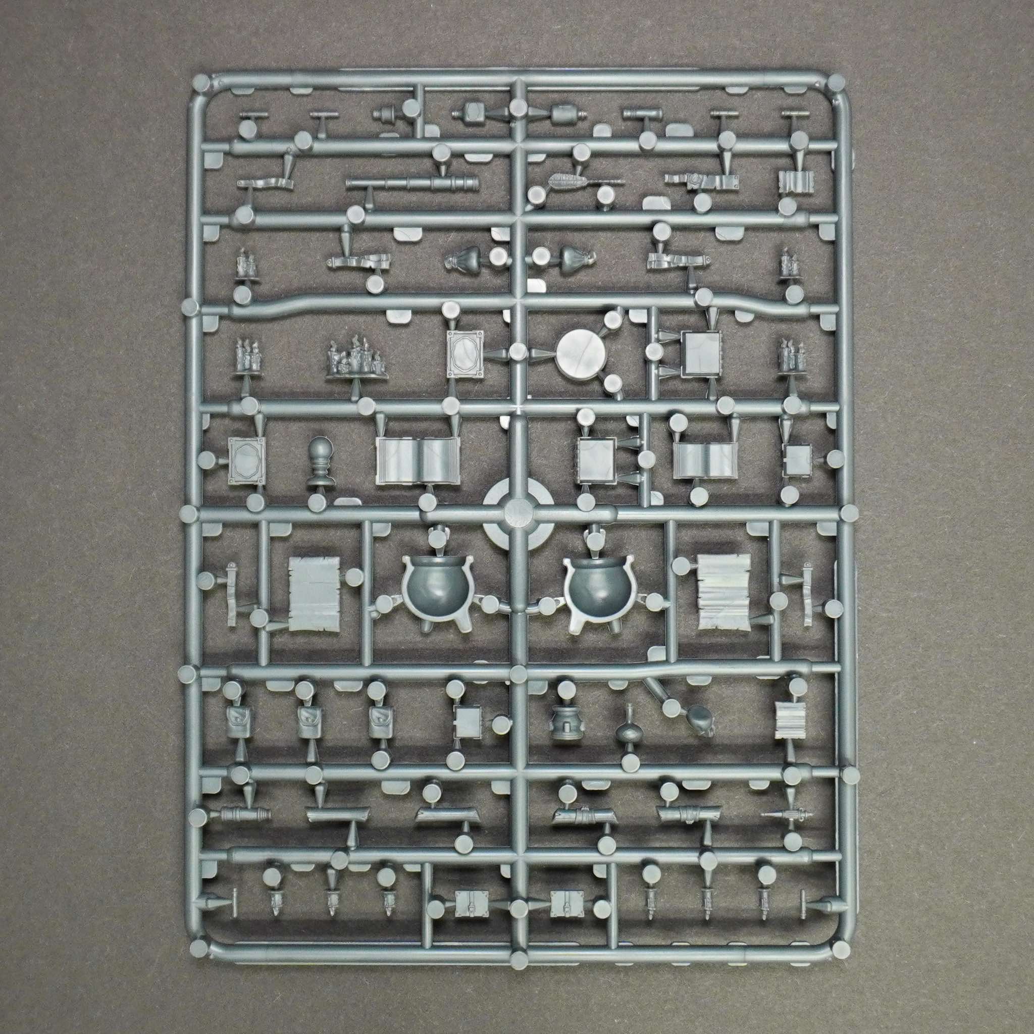 В этой коробке более 300 пластиковых деталей для ваших моделей, подставок, диорам и многого другого! Всё, от котлов и мешков до свечей, фолиантов, зелий... и многого другого!