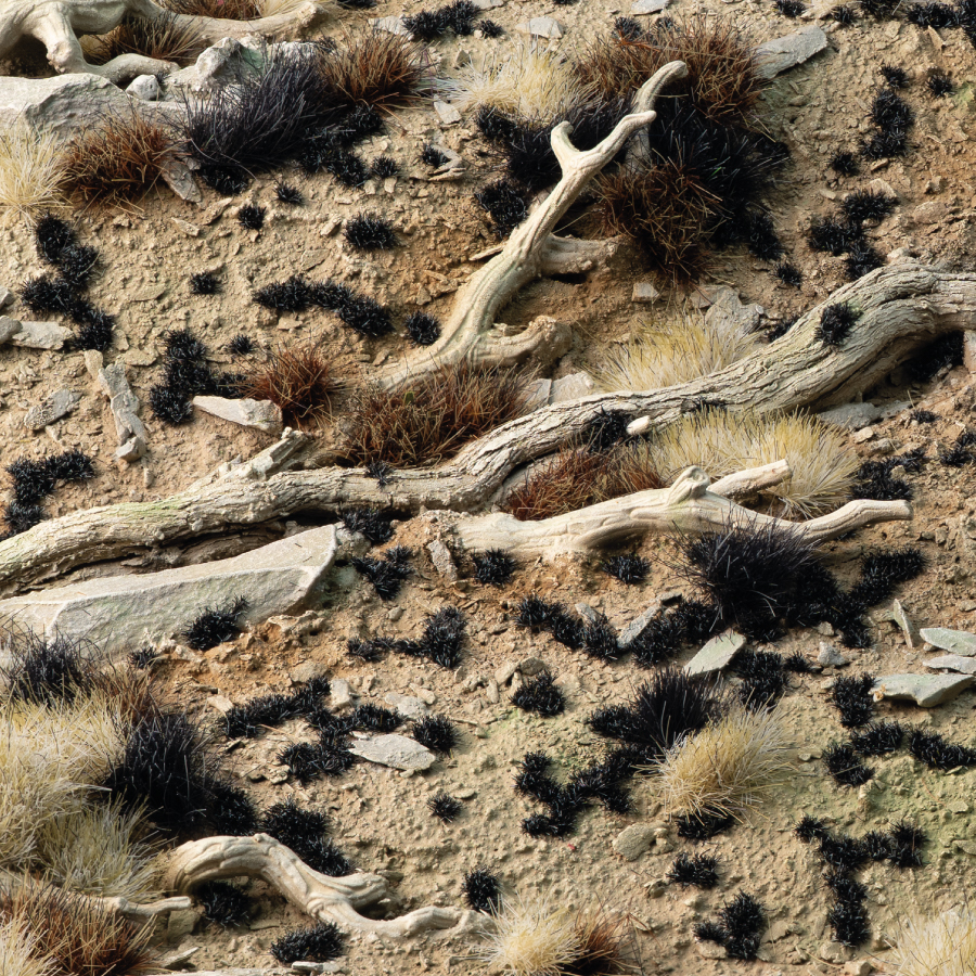 Очень маленькие и низкие пучки с черными оттенками. Лучше всего использовать для имитации темных корковых лишайников на камнях, коре и затененной земле. В сочетании с другими цветами и текстурами они обеспечивают реалистичную детализацию. В очень маленьком масштабе они идеально подходят для воссоздания шероховатых, выветренных поверхностей.