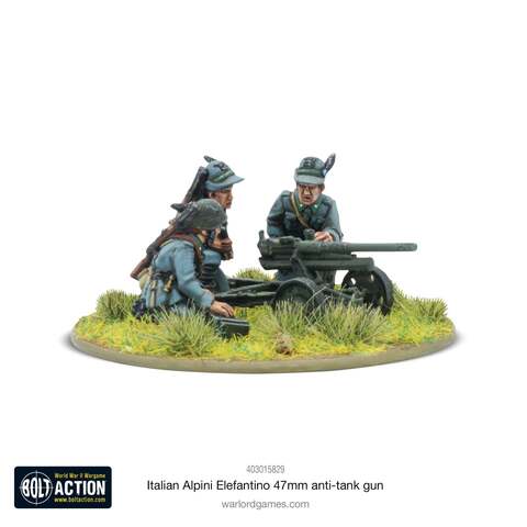 В набор входит одна металлическая противотанковая пушка Elefantino 47 мм с тремя итальянскими альпийскими стрелками и пластиковой подставкой.