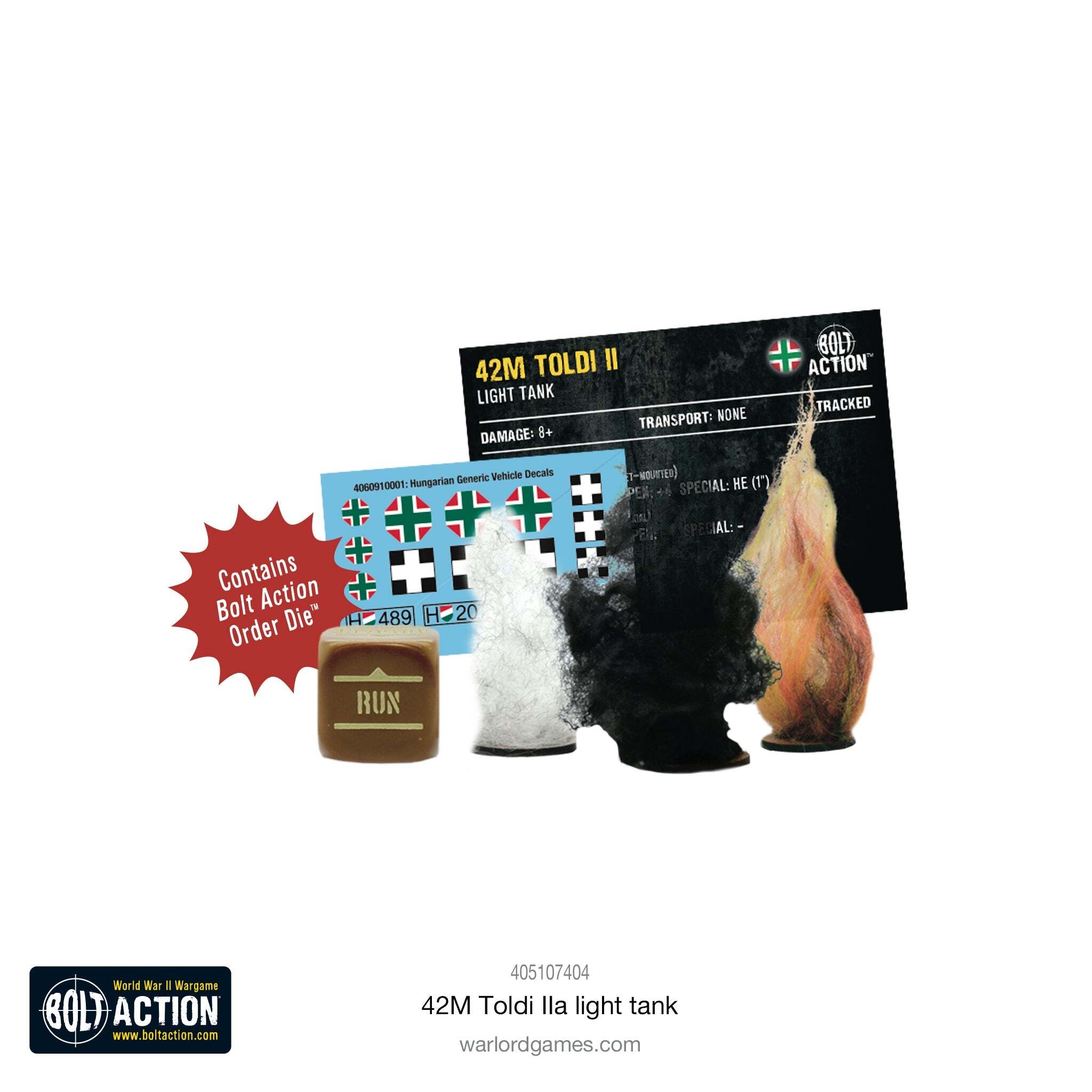 В коробке находится один легкий танк 42M Toldi Iia, отлитый из смолы и металла, с листом декалей, кубиком приказа, карточкой статистики Bolt action: третье издание и маркерами повреждений техники. Модель предоставляется в разобранном и неокрашенном виде.