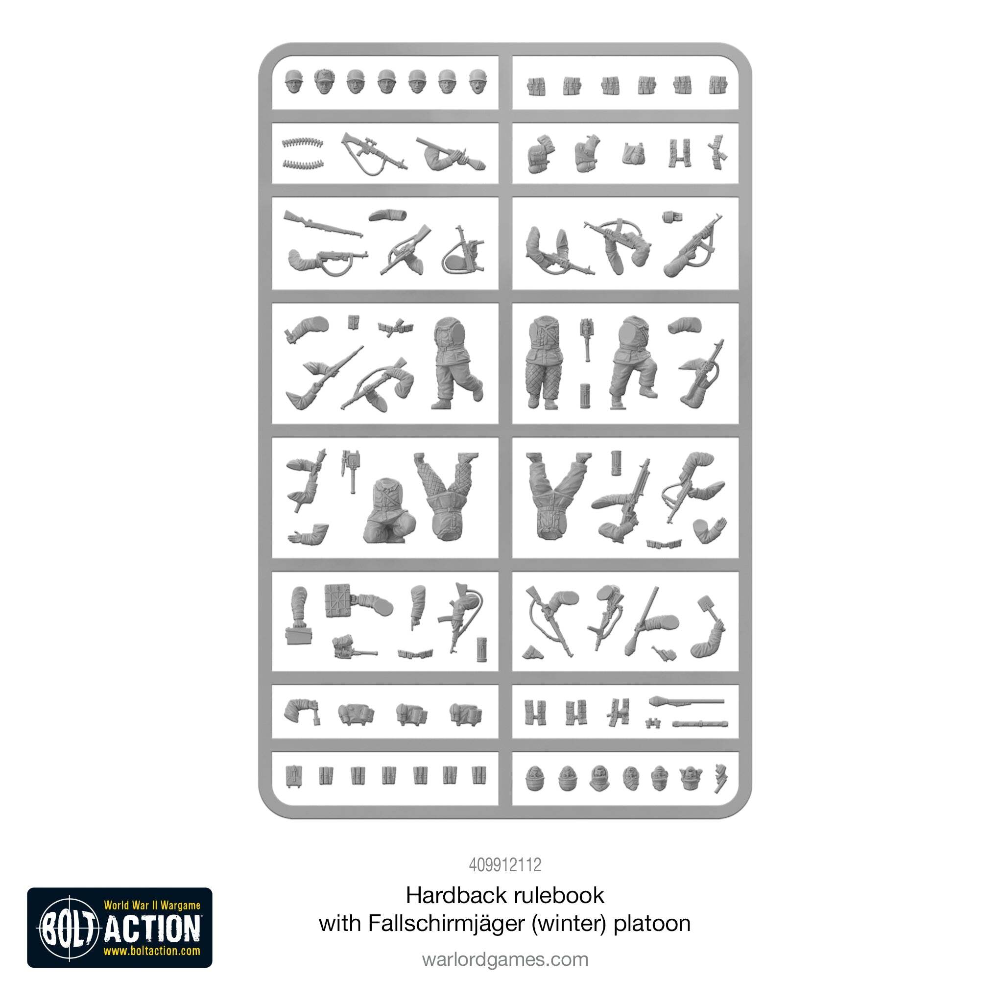 В комплект входит: Bolt Action: книга правил третьего издания полного формата, взвод егерей-парашютистов в зимней форме (30 пластиковых пехотинцев).