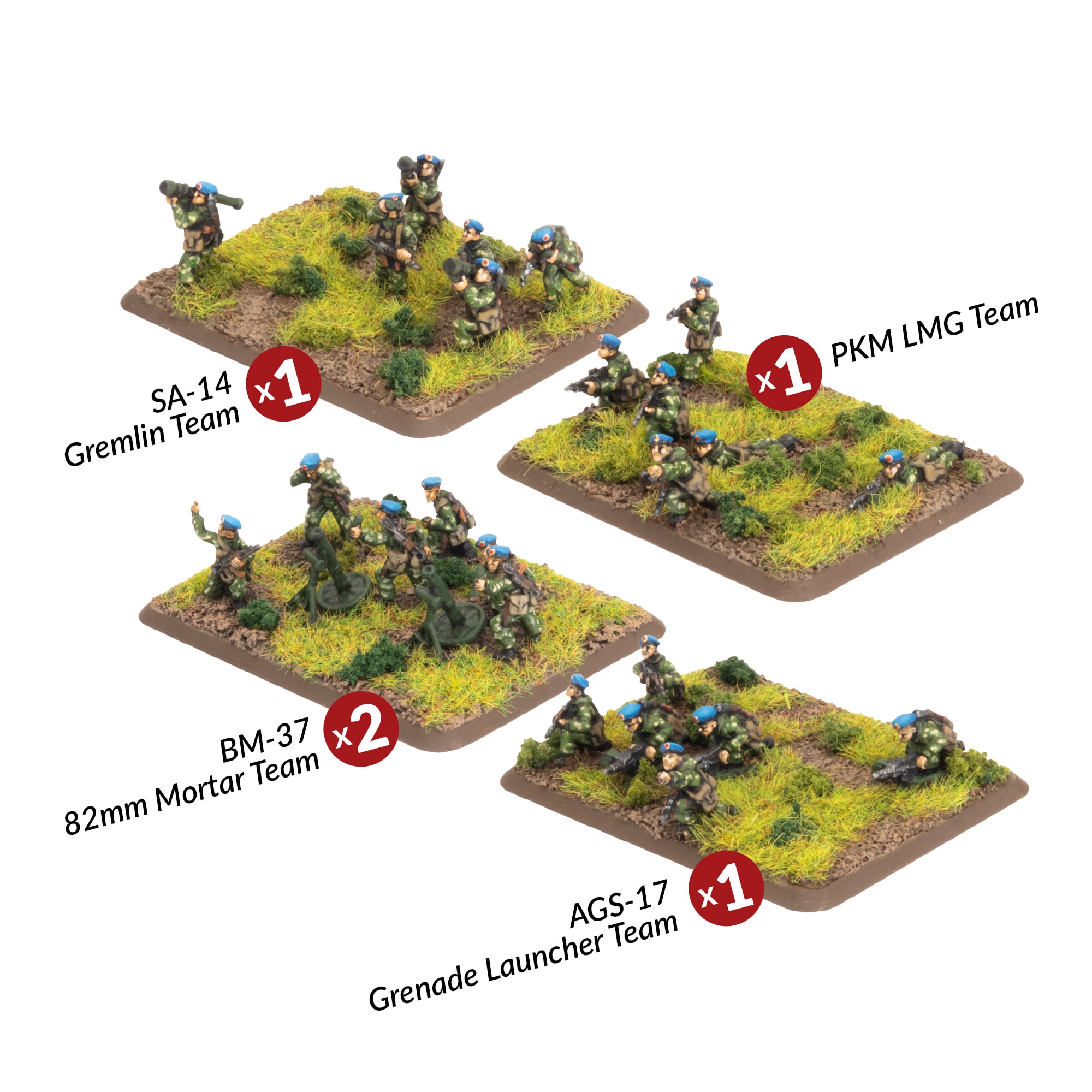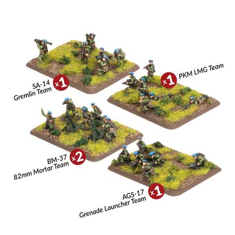 Советские воздушно-десантные войска используют проверенный временем 82-мм миномет БМ-37, впервые поступивший на вооружение в 1937 году. Модернизированный на протяжении всей своей истории, он получил современные типы боеприпасов, что позволило увеличить эффективную дальность стрельбы. Помимо нанесения кратковременного залпа фугасных снарядов по цели, он также может вести дымовую завесу, ослепляя противника или скрывая передвижения советских десантников.