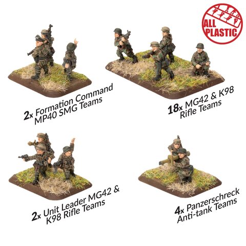 Стрелковые взводы парашютистов больше обычных стрелковых взводов, чтобы обеспечить ожидаемые потери при десантировании. Эта дополнительная численность обеспечивает им большую устойчивость в длительных наземных операциях. Боевой дух парашютистов в сочетании с их дополнительной командой в отделении делает их самой стойкой и грозной немецкой лёгкой пехотой.