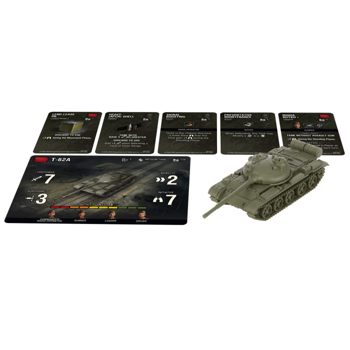 Советский Т-62А, способный легко обгонять более медленные танки, является топовой конфигурацией среди средних танков: высокая живучесть и мобильность в сочетании с первоклассной огневой мощью и инициативой. Максимально используйте высокую инициативу Т-62А, взяв «Марию Бойко» и «Ленд-лиз нефти», а также усильте остальную часть своего взвода с помощью «Усиления связи».