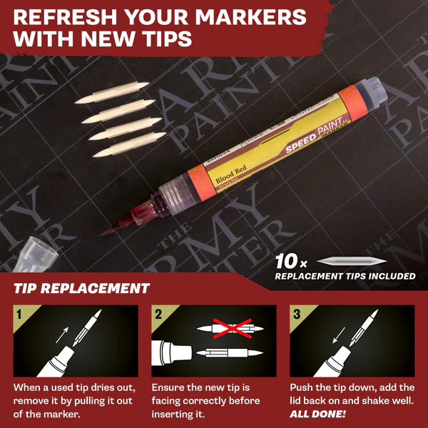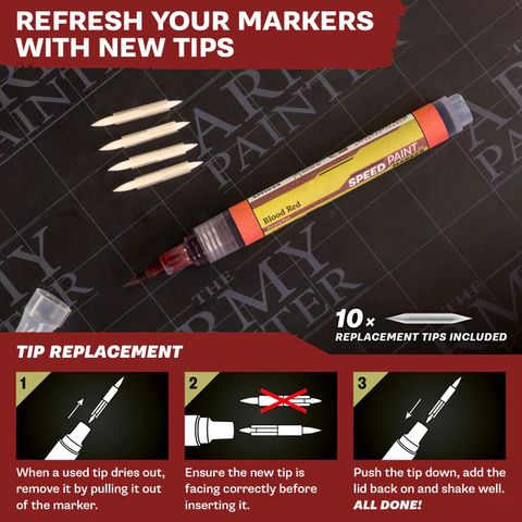 Когда наконечник со временем износится или высохнет, просто выньте его и вставьте новый, чтобы ваши маркеры Speedpaint оставались в отличном состоянии и продолжали свою основную функцию: покрывать ваши миниатюры нашей краской Speedpaint 2.0 в один слой.
